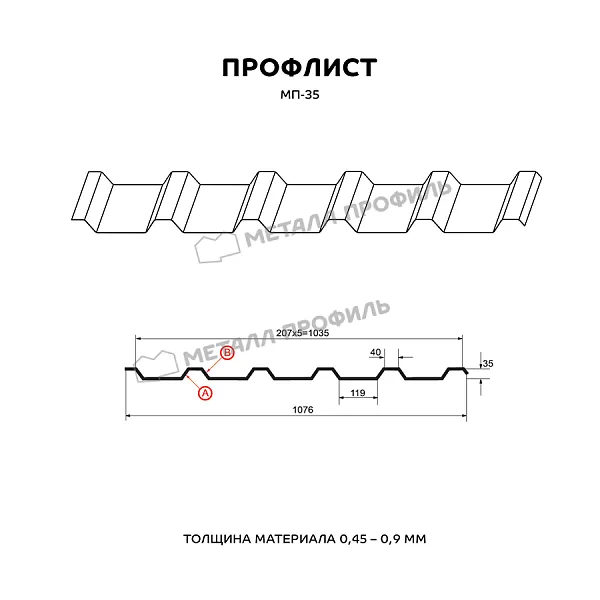 Профлист МЕТАЛЛ ПРОФИЛЬ МП-35x1035-B (ПЭ-01-3005-0,7) широко применяется для монтажа профилированного листа. Представляет собой лист оцинкованной стали с покрытием. Общая толщина металла с цинковым и декоративно-защитным покрытием — 0.7 мм. После проката на специальном оборудовании металл приобретает рисунок из повторяющихся волн. Несущая способность такого листа на порядок выше плоского.Профиль МП-35: